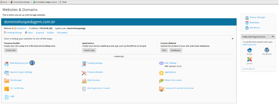 Acesse o Painel de Controle através do endereço: https://painel.provedor.com.br Acesse o domínio ao qual deseja manipular através de um clique duplo (1):