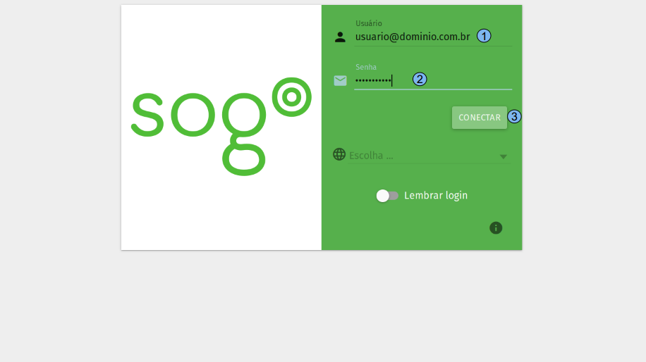 Para utilizar a versão Web da solução de colaboração, acesse o endereço: https://m.dominio.com.br . Utilize o usuário (1) e senha (2) previamente cadastrado na sua empresa e por fim, aperte no botão “Conectar” (3).
