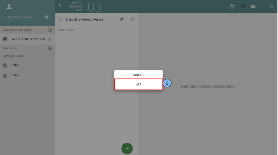 Apresentação da tela inicial do catálogo de endereços. (1)Exibe lista de catálogos, por padrão o “Livro de Endereço Pessoal” já vem criado. (2)Lista de contatos criados no catálogo selecionado no passo (1). (3)Dados do contato selecionado no passo (2). (4)Criar novo contato.