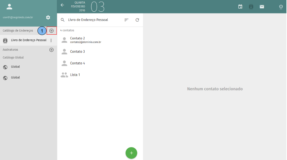 (1)Selecione o catálogo onde o contato será criado. (2)Clique em adicionar no botão (+).