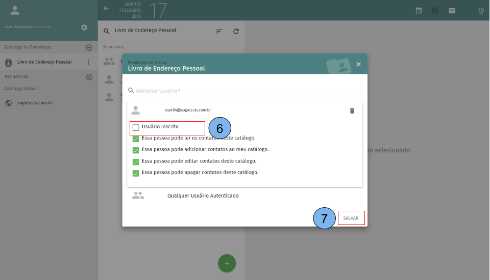 (6) Após selecionar o e-mail marque a opção “Usuário inscrito”. (7) Clique em salvar para o catálogo ser compartilhado.