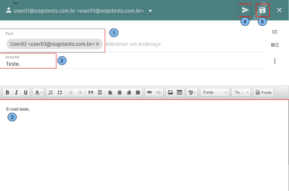 Para escrever um novo e-mail siga o seguinte procedimento: (1) No campo “Para” digite o endereço de e-mail do destinatário e clique no botão “Enter” do seu teclado. Obs: Se estiver usando o celular ou outro dispositivo móvel, após digitar o endereço de e-mail do destinatário, clique no botão pesquisa (desenho de uma lupa). (2) Escreva o assunto. (3) Escreva o corpo da mensagem. (4) Após digitar a mensagem clique no botão “Enviar”. Obs: Caso não tenha terminado de escrever a mensagem, é possível salvar a mesma no botão “Salvar”