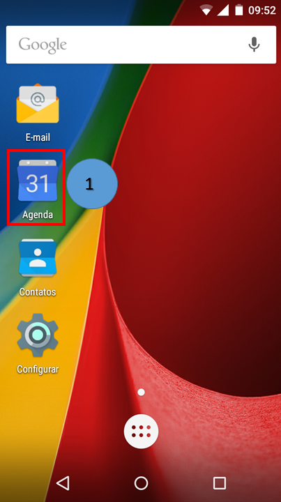 As telas abaixo mostram como criar eventos em dispositivos Android. Abra o aplicativo “Agenda” em seu dispositivo (1).