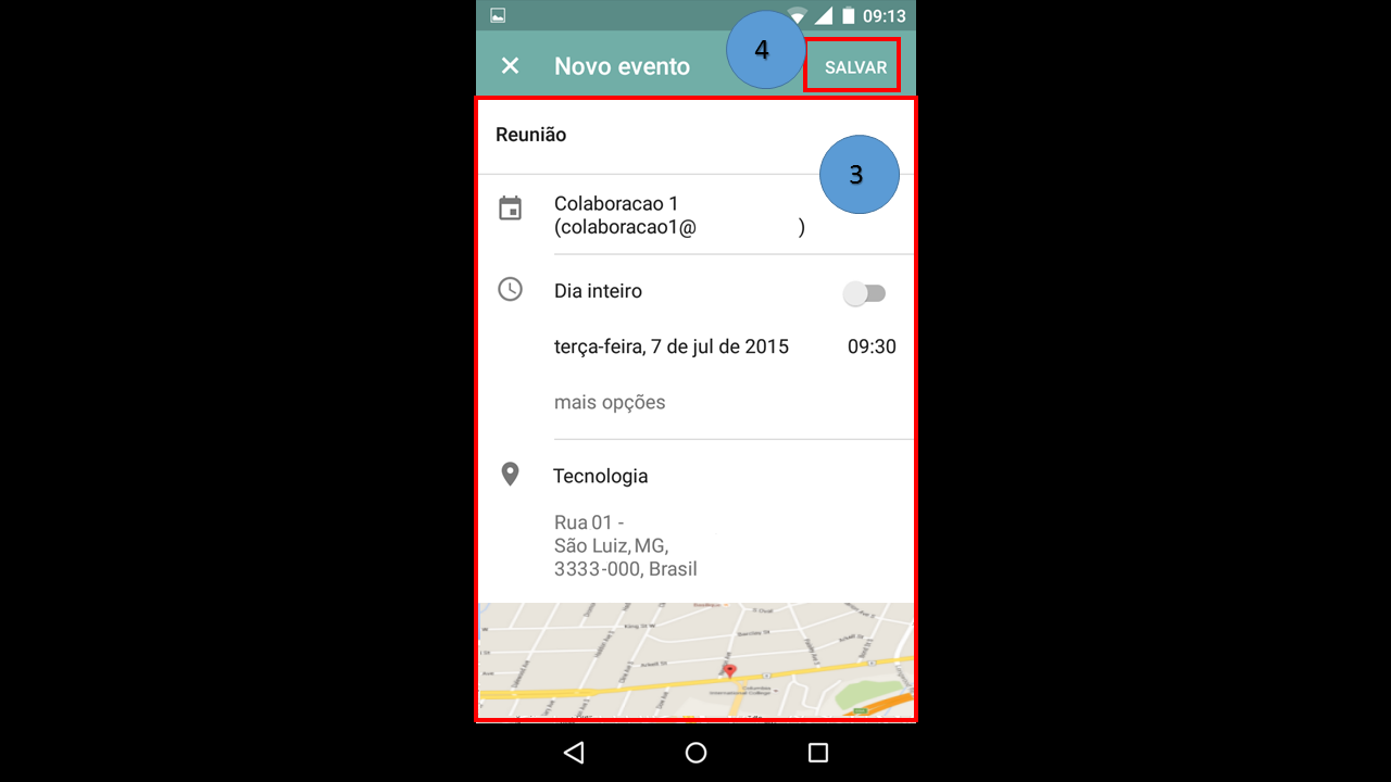 Na próxima tela selecione o calendário onde o novo evento será criado e preencha as informações do mesmo (3), depois clique em “Salvar” (4).