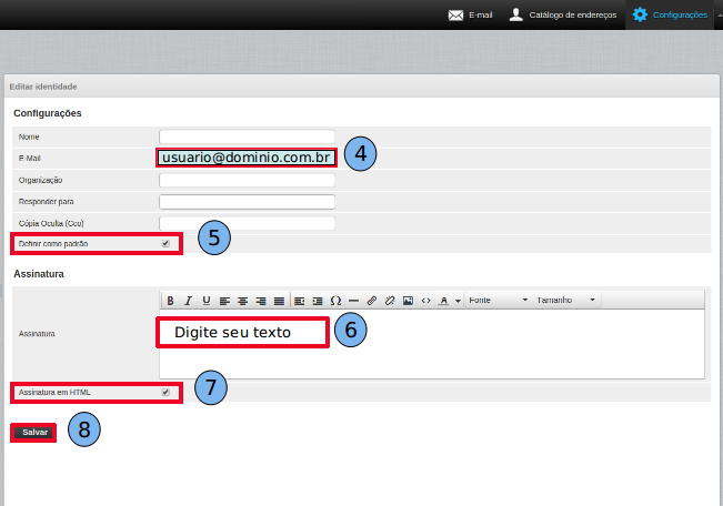 Então abrirá as opções para edição, “Editar Identidade”. Insira o “Endereço de e-mail” (4) e marque a opção “Definir como padrão” (5). Marque a opção: “Assinatura em HTML”(7), para habilitar as opções de configuração básica do texto, e também a opção de editá-la com um código HTML. Após “inserir o texto” (6) de assinatura, clique em “Salvar” (8).