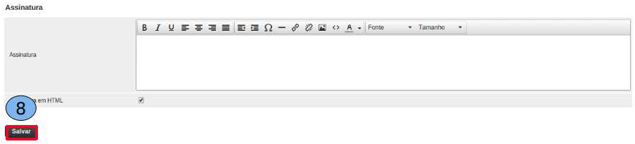 Então o editor irá fechar e a imagem da assinatura já estará inserida. Após isto clique em “Salvar” (8).