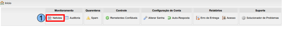 Para iniciar o processo de visualização e filtro de e-mails via netview do usuário, na tela inicial do Painel de Controle do usuário, como exemplo, será utilizado “teste@domínio.com.br”, clique em “Netview” (1).