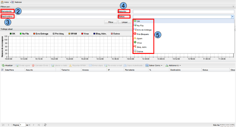Para que a busca no filtro do netview fique mais apurada, é possível filtrar por “Remetente” (2) e/ou “Destinatário” (3), para tal insira um e-mail “teste@dominio.com.br” ou domínio “dominio.com.br” nos respectivos campos, lembrando que domínio é tudo aquilo que vem após o “@”. Em “Assunto” (4), a busca pode ser realizada por alguma palavra contida no assunto do e-mail. Em “Status”, a busca pode ser realizada por algum status de e-mail contido na opção (5).
