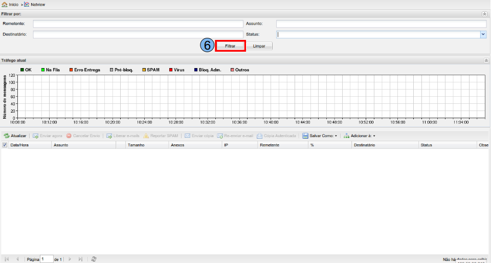 Após definir os dados da busca clique em “Filtrar” (6), os e-mails serão carregados conforme filtro realizado. Abaixo da opção “Filtrar”, será exibido um gráfico com o fluxo de e-mails enviados e recebidos, além de seus status.