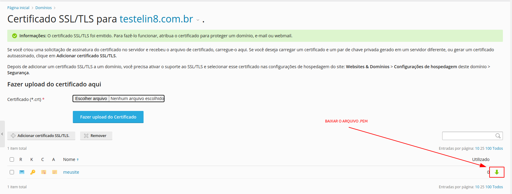 - Depois de clicar no botão Solicitar, baixe o arquivo .pem e encaminhe para sua certificadora.