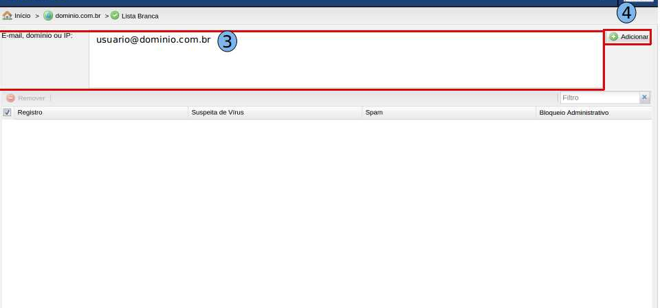 No campo “E-mail, domínio, IP” (3) adicione o endereço de e-mail que deseja adicionar na Lista Branca”, logo depois clique em “Adicionar” (4)