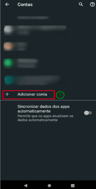 Abra o aplicativo de email no seu celular Android. No exemplo será utilizado o aplicativo Gmail, mas a configuração é válida em qualquer cliente de email (outlook, etc). Clique em Adicionar conta (1).
