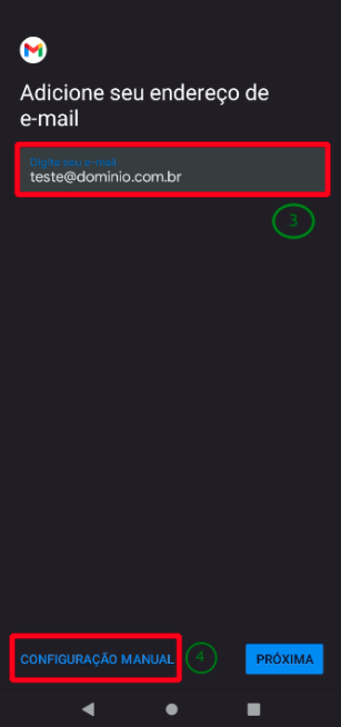 Informe o seu Endereço de Email (3) e clique em Configuração Manual.(4)