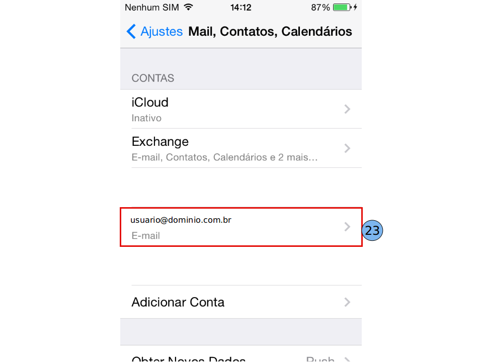 "Servidor de Correio de Saída": Nome do Host (18): mail. dominio.com.br Nome de Usuário (19): digite seu e-mail. Senha (20): digite sua senha. Seguinte (21).