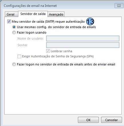 Na aba Servidor de saída, marque a opção Meu servidor de saída (SMTP) requer autenticação (13), a opção abaixo Usar mesmas configurações do servidor de entrada de e-mails será marcada automaticamente, depois basta clicar na aba Avançado.