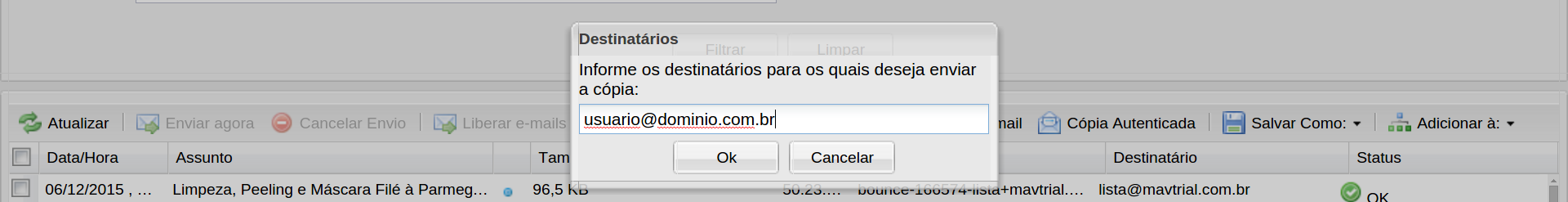 Selecione os e-mails que deseja recuperar e clique em “Enviar Cópia” (7), escreva o e-mail de destino e clique em “Ok”
