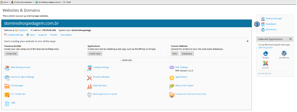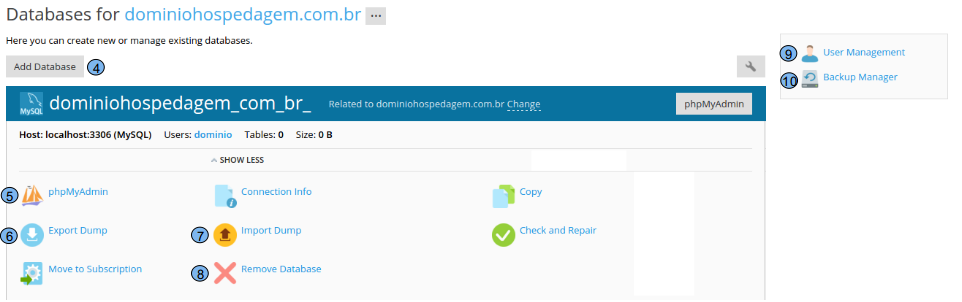 Na tela de administração de banco de dados temos as principais opções: (4) Add Database: Utilizado para realizar a criação de um novo banco de dados (5) phpMyAdmin: Utilizada para gerenciar o banco de dados já criado (6) Export Dump: Realiza a exportação do banco de dados (7) Import Dump: Utilizado para importar um backup (8) Remove Database: É utilizado para remover o banco de dados criado (9) User Management: É utilizado para remover ou alterar a senha do usuário do banco de dados (10) Backup Manager: Pode ser utilizado para gerar e gerenciar backup da base de dados
